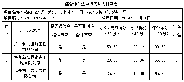 | 廣州宏達工程顧問集團有限公司(以下簡稱“招標代理機構”)受揭陽市盈輝工藝總廠(以下簡稱“招標人”)的委托,于2019年1月3日就揭陽市盈輝工藝總廠E棟生產車間1樓及5樓電氣改造工程(項目編號GZHD18MZGGF11021)采用公開招標方式進行采購。現就本次招標的中標結果公告如下: 一、招標人名稱:揭陽市盈輝工藝總廠 二、項目名稱:揭陽市盈輝工藝總廠E棟生產車間1樓及5樓電氣改造工程 三、項目編號:GZHD18MZGGF11021 四、招標方式:公開招標 五、招標項目簡要說明:(包括內容、簡要技術要求、合同履行日期等) 1、項目內容:揭陽市盈輝工藝總廠E棟生產車間1樓及5樓電氣改造工程; 2、簡要技術要求、合同履行日期:詳見招標文件用戶需求。 六、招標公告日期及媒體:招標代理機構于2018年12月10日在公開的媒體廣州宏達工程顧問集團有限公司(http://www.wangtat.com.cn/)、中國采購與招標網(http://www.chinabidding.com.cn/)上發布了招標公告。 七、評審信息: 1、評審日期:2019年1月3日 2、評審地點:梅州市梅江區客都大道東匯城寫字樓D2棟10樓1006號(廣州宏達工程顧問集團有限公司梅州分公司) 3、評標委員會負責人:潘廷 4、評標委員會其他成員:蔡堅、陳志年、朱志勇、鐘輝 八、評審結果詳情如下: ![]() 九、中標信息: 1、中標人名稱:廣東和安建設工程有限公司 2、法人代表:管劍開 3、中標人地址:梅州市梅縣區程江鎮憲梓大道(和安大廈) 4、中標金額(人民幣):伍拾玖萬玖仟捌佰捌拾元零捌分(¥599,880.08) 十、本公告期限1個工作日。 十一、聯系事項: 1、招標人聯系方式 招標人名稱:揭陽市盈輝工藝總廠 招標人地址:廣東省揭陽市揭東區玉窖鎮 2、招標代理機構名稱:廣州宏達工程顧問集團有限公司 招標代理機構聯系地址:梅州市梅江區客都大道東匯城寫字樓D2棟D2-1006號 項目聯系人:卓先生 招標項目聯系電話:0753-2259923 招標代理機構傳真:0753-2251923 此中標公告即為招標結果通知書。如果投標人對此結果有異議的,可以在中標公告發布之日起七個工作日內以書面形式向我公司提出質疑,質疑函中應明確權益受到損害的事實與理由。逾期將依法不予受理。 特此通知! 廣州宏達工程顧問集團有限公司 2019年1月4日 |